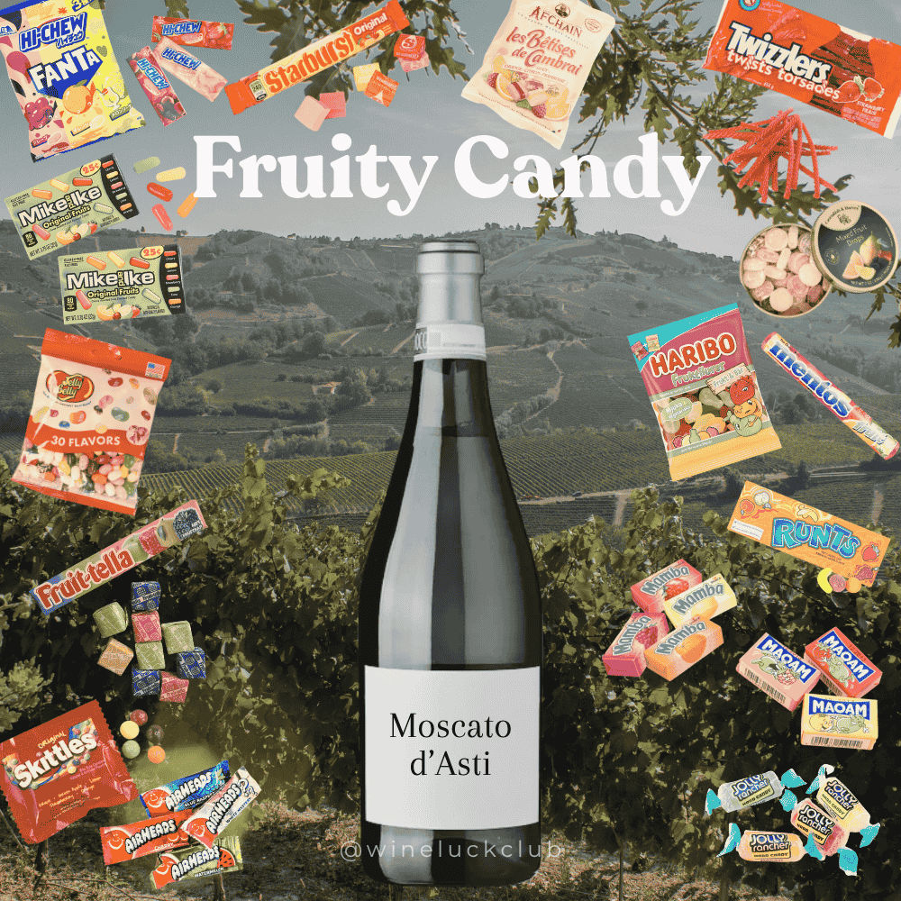 Fruity candies can be chewy, like Starbursts, or hard shell-coated, like Skittles and jellybeans. They can be hard candies, like Jolly Ranchers or French pastilles. The category overlaps with gummy candies, and sure, there’s even a sour bite to some fruity candies, like tamarind candies or AirHeads. Whichever way you land, these candies will benefit from similarly juicy, fruity wines, especially those with gentle bubbles to keep things feeling fresh, like Moscato d’Asti.