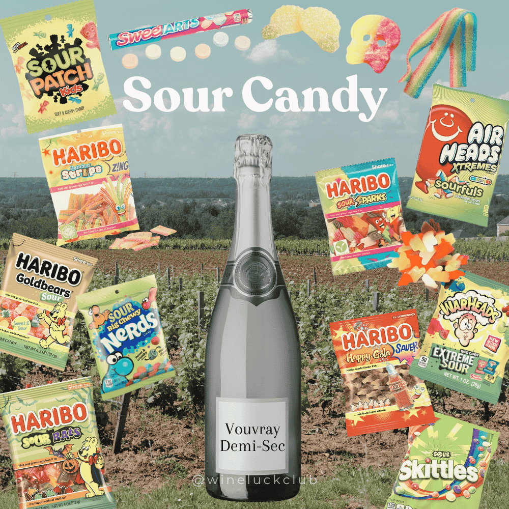 When I was young, I used to eat giant SWEETarts and Extreme Sour Warheads so slowly that my tongue would roughen up like a cat’s after just a few, numbing my ability to taste much at all afterward. The experience didn’t deter me from sour candy though; I still enjoy that prickling-ly intense hit of acid every once in a while. Any sweet wine paired with these candies needs to be able to match that tart lemonade-like balance of sweet and sour, which is why I recommend a Vouvray Demi-Sec, ideally a Mousseux, or a sparkling one, to mimic that prickling feeling on your tongue.
